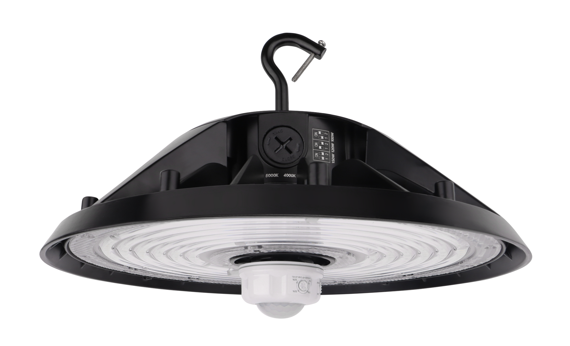 The HBF UFO high bay delivers versatile illumination with three selectable wattage options and dual color temperature settings, adapting seamlessly to diverse commercial and industrial applications. Choose between standard 150 lm/W efficiency or the high-performance 170 lm/W version to optimize energy consumption. Built-in 0-10V sensor port enables straightforward installation with quick plug-and-play capability, while optional Zhage base compatibility expands control possibilities. DLC and NLC system certified for maximum rebate eligibility. Engineered with IP65 and NEMA 4X ratings for heavy-duty environments, this fixture includes a G hanging hook with U bracket, pendant mount adapter, and O hook accessories available separately.
